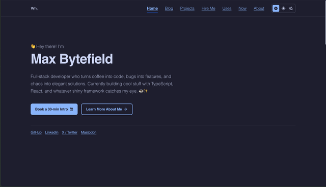 A beautifully minimal, accessible blog theme for Astro, featuring the elegant Catppuccin color palette. This theme comes pre-configured with example content featuring "Max Bytefield" - a fun developer character perfect for showcasing what a developer portfolio could look like.