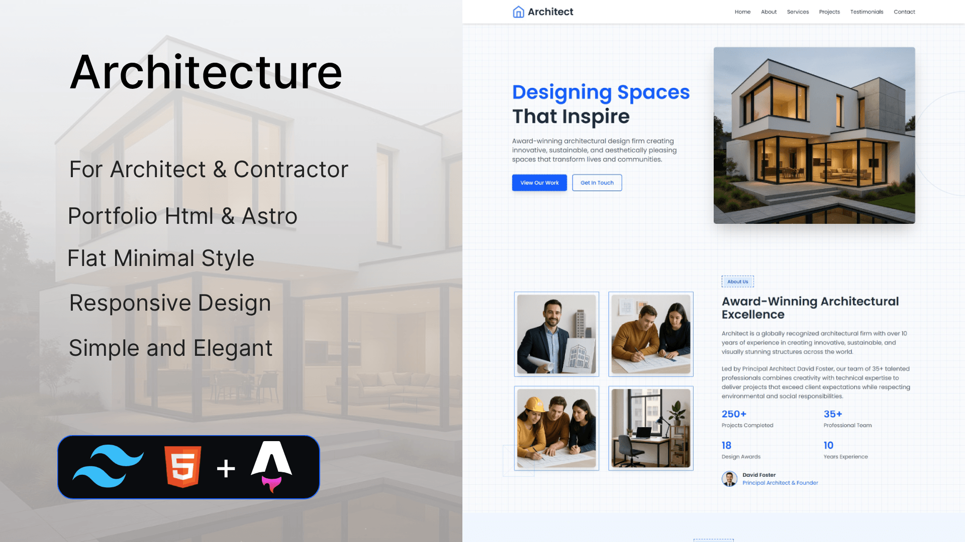 Architecture is a Architect Portfolio Website Template crafted with Astro and Tailwind CSS, designed specifically for Architect and Contractor. Built with Tailwind CSS and Alpine.js. With a clean, structured layout and highly customizable components, Architecture helps you showcase your projects with precision and elegance.