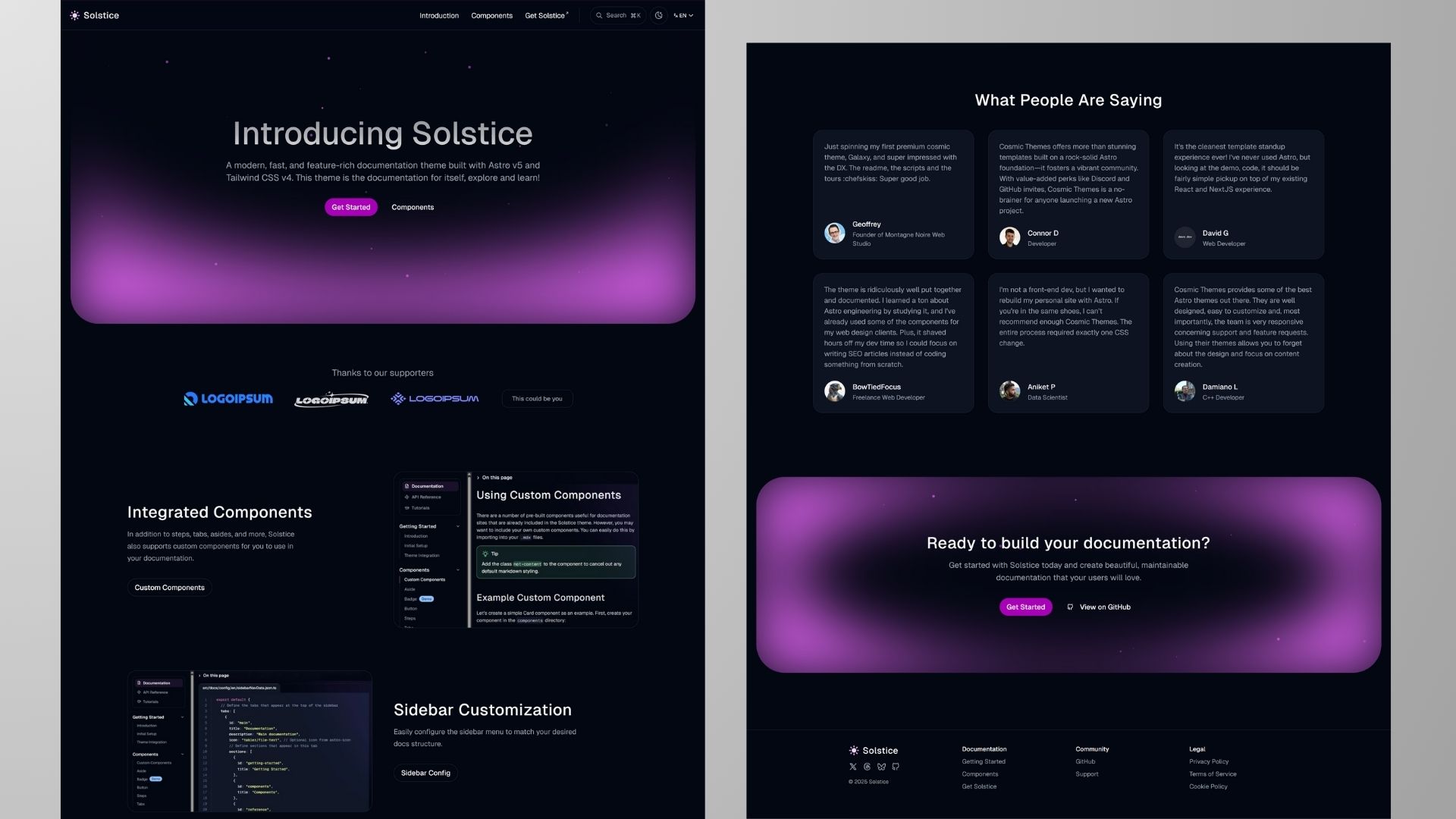 Upgrade your website with stunning feature-rich documentation, designed to easily integrate with other templates by Cosmic Themes. With tons of features to make your life easy, it’s the perfect choice for developers, freelancers, and agencies.